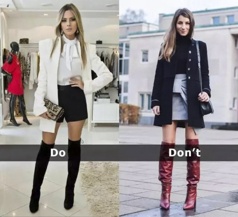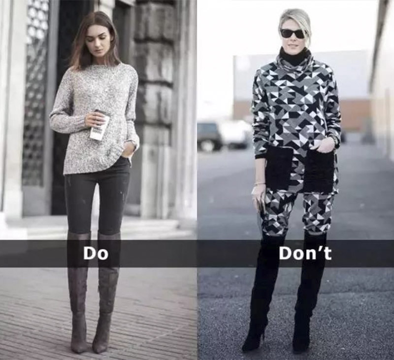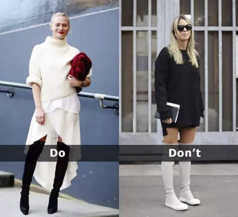从上面的对比图上应该不难看出来黑过膝靴+黑裤子,会比黑过膝靴+蓝裤子显得腿部更加修长,视觉上鞋腿连为一体,而不是像右边这位一样从腿部被砍掉一截。