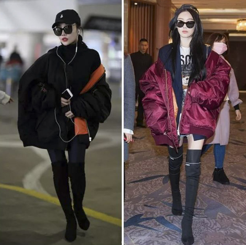 现在已经不流行松松垮垮的长靴了,紧贴腿部的款式才能显得小腿又细又紧致。看上面两张图的对比,两位身材相差无几,但右边一双褶皱的宽松长靴,显得壮硕无比!