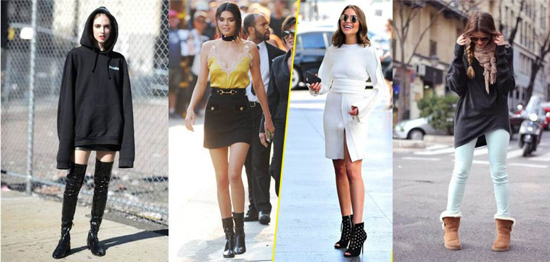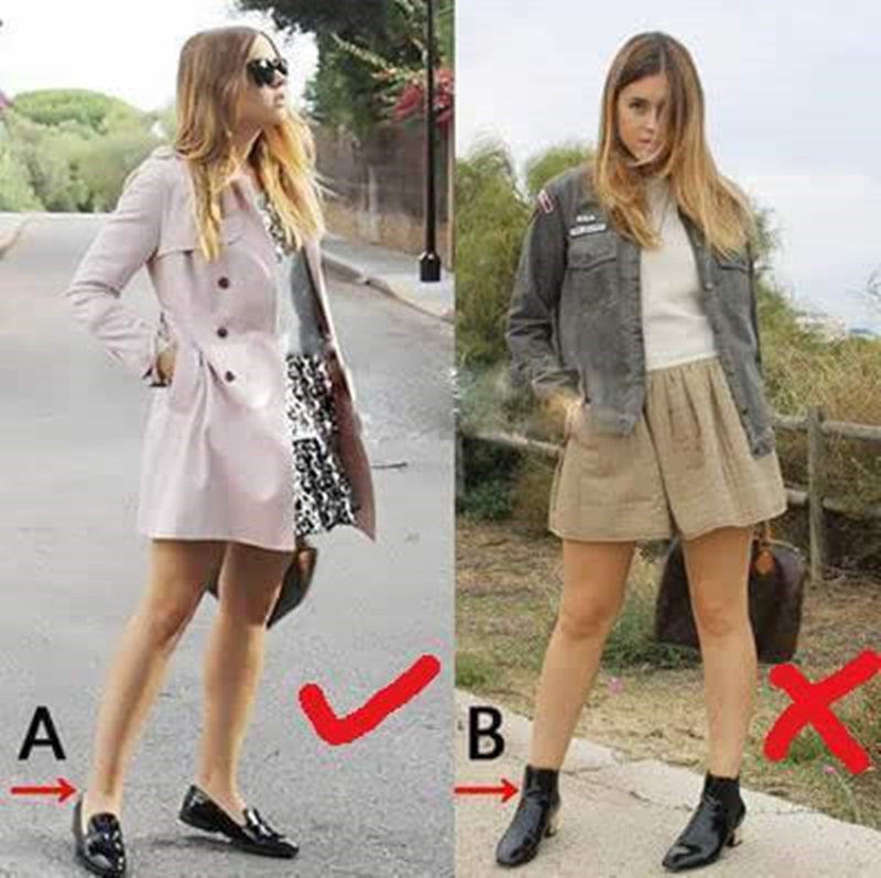 比如上图中A和B的对比图就可以让我们清楚的看出来,对于同等身高的妹子们来说,在选择鞋子方面可以选择一些浅口的鞋子,比如说最近两年都比较流行的毛毛鞋就很容易搭配。相对于右边穿高跟裸靴的妹子来说,腿就在视觉上显得比较粗一些了。裸靴的长度越过脚踝仿佛鞋子遮盖住的部分都是脚部,从而显得腿比较短一些哦。
