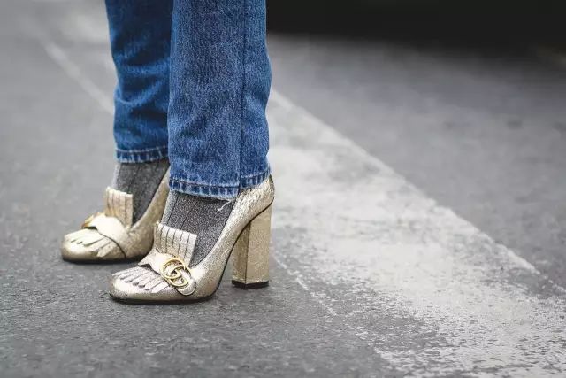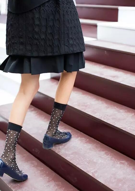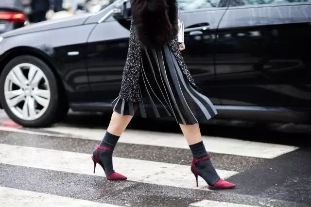 如果你够时髦够大胆,敢穿细高跟鞋配袜子,确实赋予了它另一种风格。加上穿这种细高跟鞋时,大部分的注意力都会集中在脚上,对腿型的要求就非常高了!