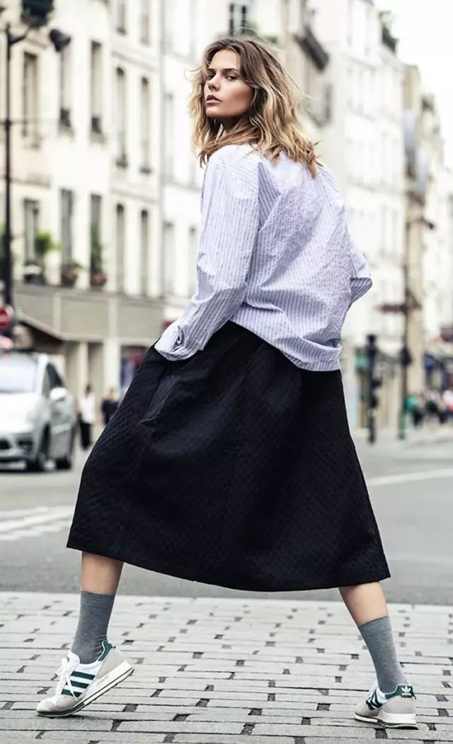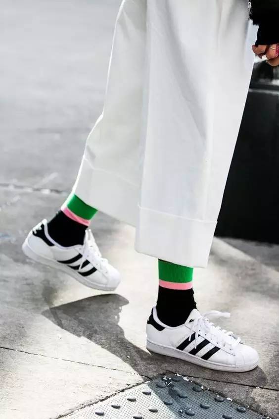 如果你想小尝试一下袜子的穿搭又不知道如何下手,就先从黑色或灰色的袜子开始吧!不仅出错率非常低,而且和很多风格都能完美搭配。注意选择到脚踝附近位置的短袜,相对比较不容易显腿粗。如果觉得纯色系的棉袜太过单调,可以选择运动风的条纹短袜,或者带点刺绣小图案也很俏皮可爱!