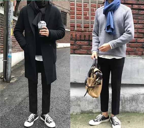 半高领的毛衣能够在视觉上拉长上半身的线条,搭配紧身的牛仔裤视觉上显高不少!休闲鞋的加入,即可将矮胖男生的气质与魅力凸显。