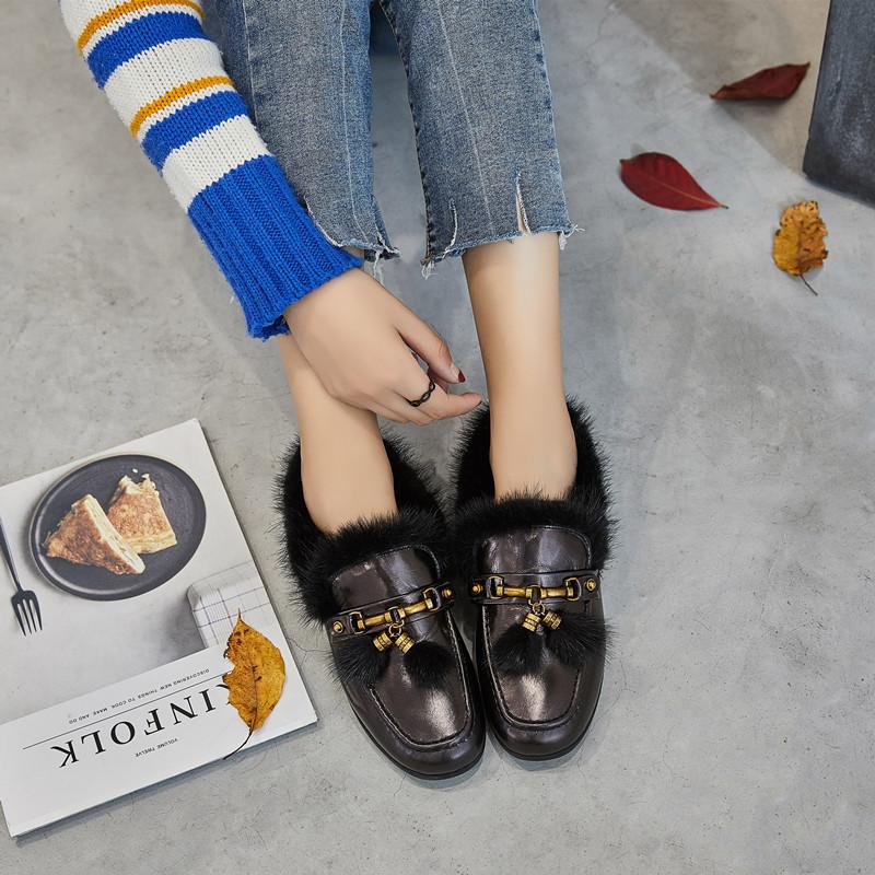 羊毛保暖豆豆鞋女加绒冬季韩版真皮黑色皮毛一体平底棉鞋毛毛鞋冬