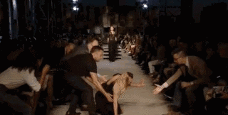 比如说为了配合设计师作品而设计的舞台,奇葩非常。作为模特,不仅要以好的姿态展示作品,被打了还不能自乱阵脚。