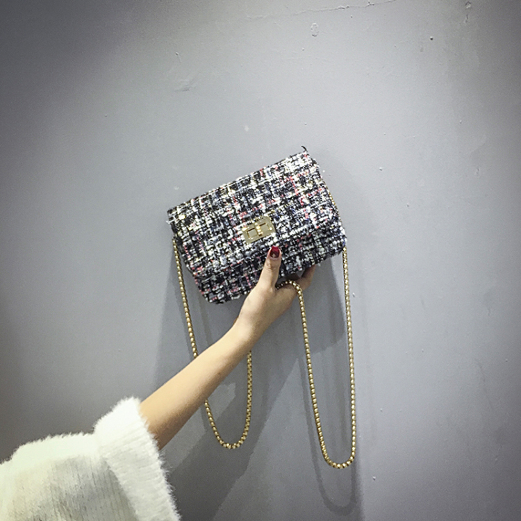 4. 毛呢链条小包。颜色是不变的颜色不随时光逐流,同样经典的毛呢也是如此,将圆圆的金属扣点缀在上面,像调皮的精灵显得潮流与时尚,不论是出街,出席晚会,疯狂PARTY都是必不可少的~