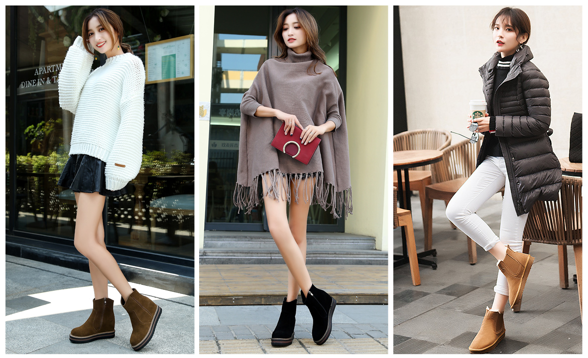 鞋子穿着舒适,内增高使娇小者瞬间拔高不少,颜色比较时尚,顺应潮流,也一改冬日沉闷。磨砂皮在冬日里穿着能给人温暖的感觉,特别是枣红色,配上羽绒服或者妮子大衣,那都是绝配的哈。