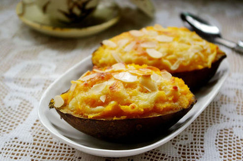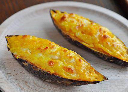 首先将红薯洗净放入微波炉,加热五分钟至熟;用勺子挖出红薯肉,不要挖的太干净破坏表皮;之后将挖出的红薯跟你白糖、黄油、牛奶和切碎的芝士混合搅匀;再将搅匀的红薯肉放入红薯托内,撒上芝士碎;之后放入烤箱中层,180°烤大约20分钟,看到表面变成金黄就完成这道美味了。