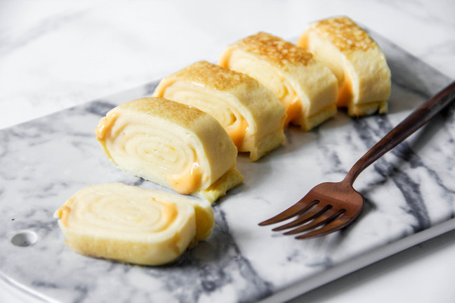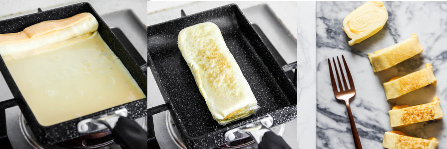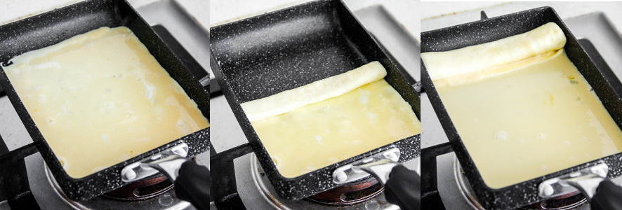 芝士和鸡蛋的完美结合,我们要怎么动手做芝士厚蛋烧呢?首先,3个蛋加上一片芝士刚刚好可以做出一份厚蛋烧。平底我刷上一层油,导入准备好的1/3单页,将其均匀摊开;接近凝固时,放上切成条状的芝士条或芝士丁;从一头慢慢的将蛋皮卷起,卷好放在锅的斜边处。