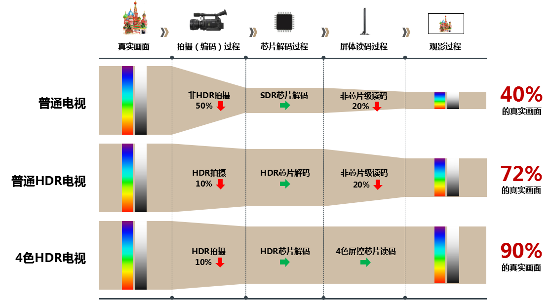 在电视机画面方面,画质不清晰通常是产品的痛点,传统电视在经过非HDR拍摄,SDR芯片解码和非芯片级解码之后,会造成50%和20%程度的画面损失,分别经过两个阶段后,画质损失接近60%。如果再配以低质量的显示屏幕,清晰度可谓是一跌再跌。因此,在电视选购上,对电视内部的配置和屏体要有足够的要求。