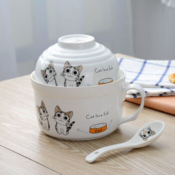 2、可爱陶瓷碗一人食餐具套装泡面饭盆成人好看单个韩式套碗带盖把手 起司猫