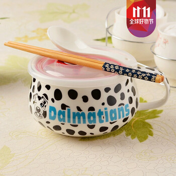2、微波炉饭盒大号陶瓷泡面碗可爱卡通泡面杯创意汤碗瓷碗带手柄带盖 斑点狗