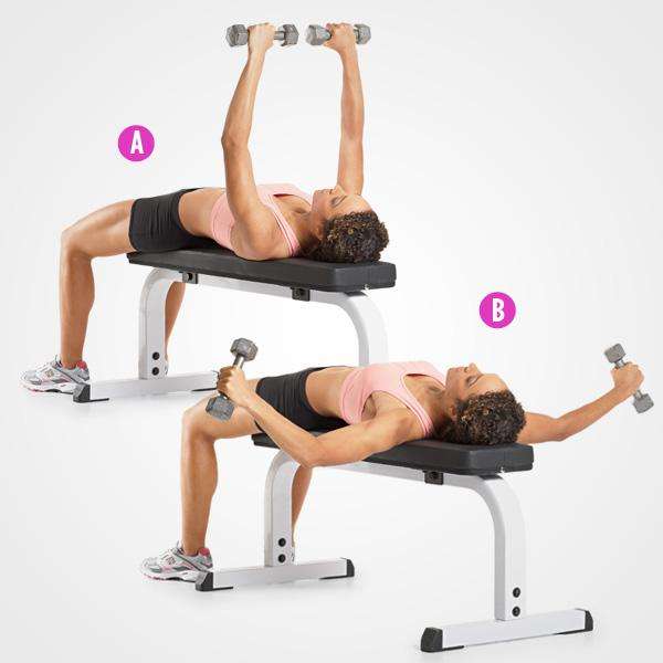 1.双手持哑铃坐在板凳上,双脚平均落在地面,接着慢慢躺平,手肘打直、挺胸缩小腹。
