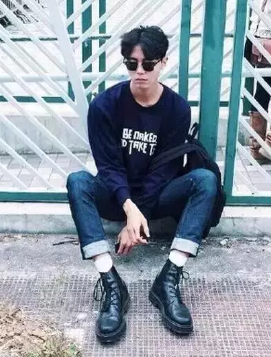 作为同样百搭的单品,牛仔裤与圆领套头卫衣的组合也十分有魅力,将裤脚稍微卷起,搭配黑色马丁靴,就能做一个阳光帅气的美男子。
