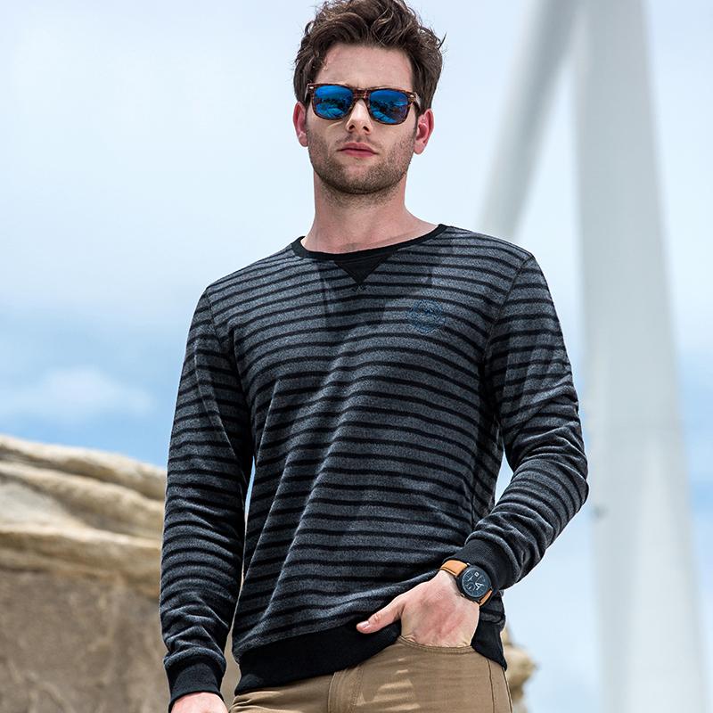 骆驼男装宽松舒适休闲棉质条纹圆领长袖卫衣
