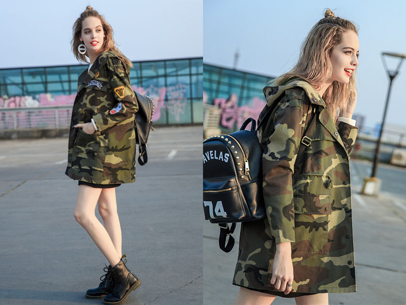 风衣是秋天最容易凹造型的款,搭配难度低,得到了懒妹子们的偏爱。将迷彩印于风衣,打破了一向优雅知性的气质,注入了前卫新潮的体验,适合年轻的小姐姐日常穿着,不会太过古板更有青春活力气。