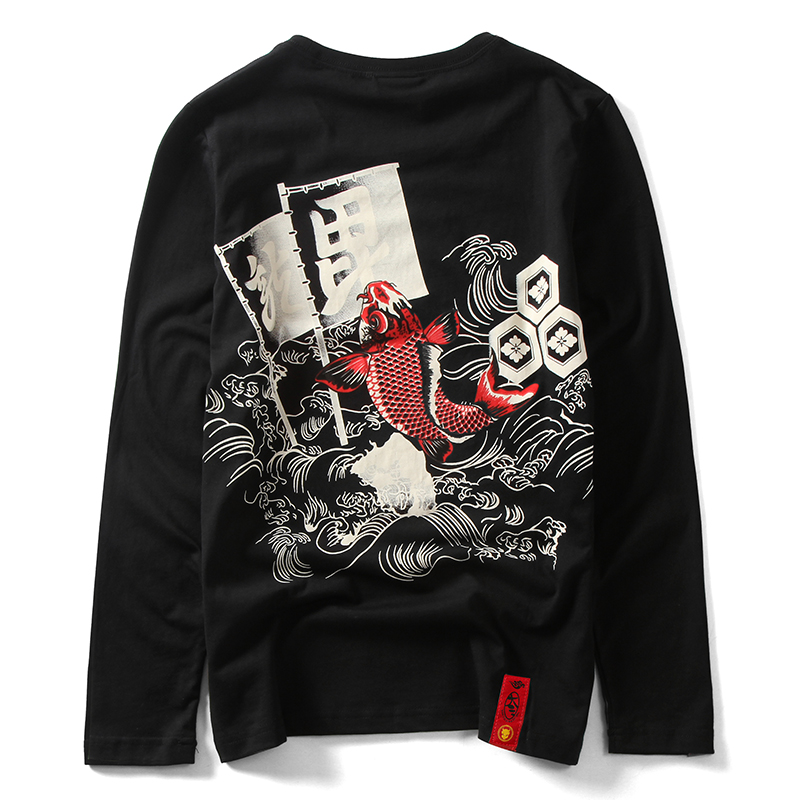 中国风民族鲤鱼日系潮牌印花嘻哈圆领大码纯棉男长袖t恤衫打底衫