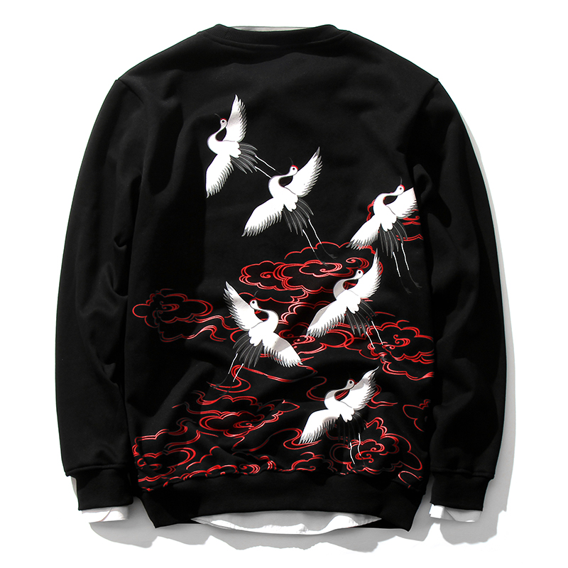 新款学生潮牌中国风复古民族风宽松圆领套头刺绣仙鹤秋季卫衣男士