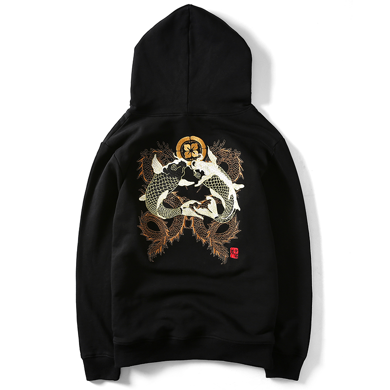 秋装新款潮牌中国风鲤鱼刺绣民族风宽松套头大码卫衣男连帽外套潮