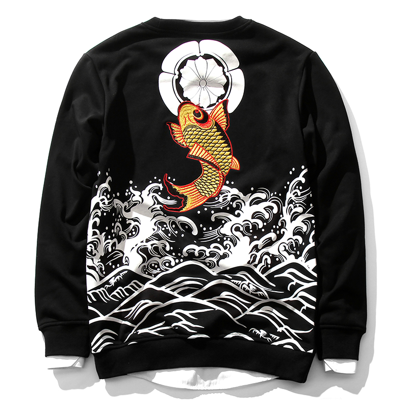 秋冬新款日系潮牌男士卫衣 中国风鲤鱼烫金刺绣纯棉大码套头卫衣