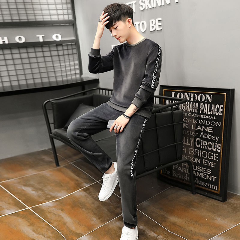 男士休闲运动金丝绒套装2017秋季新款潮男时尚青年帅气跑步两件套