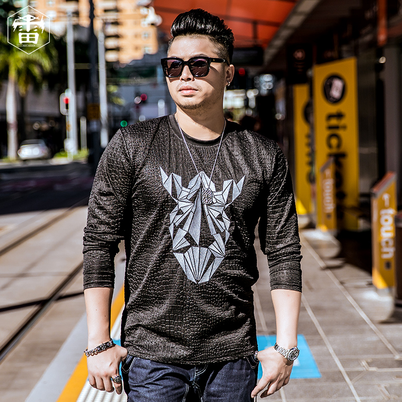 雷哈格尔大码男装秋季新款宽松体恤仿鳄鱼皮纹理潮男胖子长袖T恤