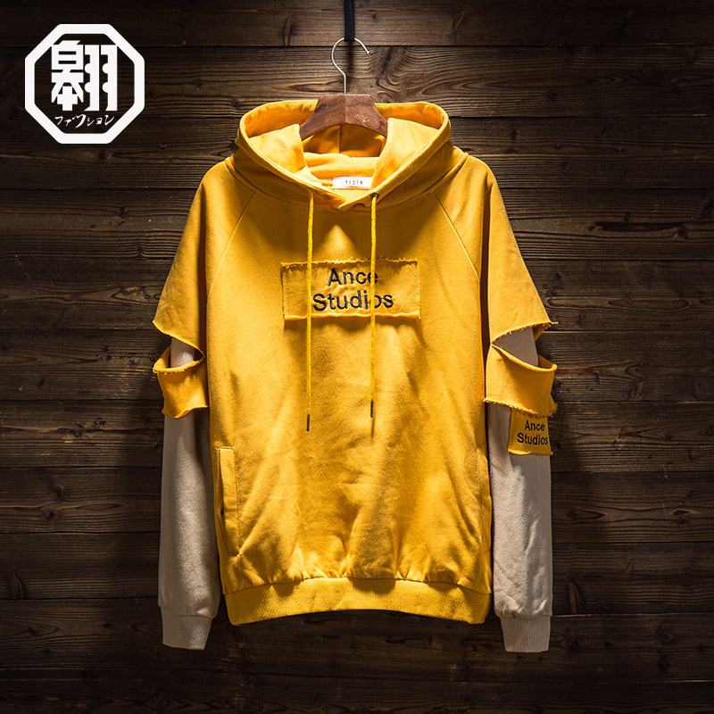 秋季新款潮男连帽卫衣个性假两件学生卫衣男套头嘻哈外套大码男装