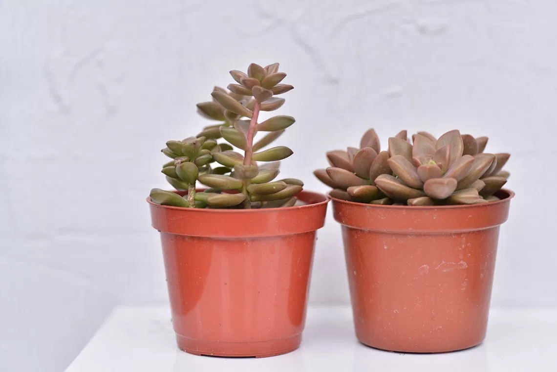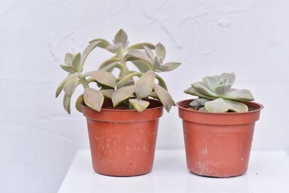 比较两种多肉的不同,第一盆是秋丽、第二盆为胧月,很明显你可以看得出来,左边的多肉茎拉得比较长,叶子与叶子的间距变宽,看起来是有在长大没有错。不过要注意!若是持续这样拉得长长的,长大的地方都是中间的枝干,这样就会是“徒长”咯!