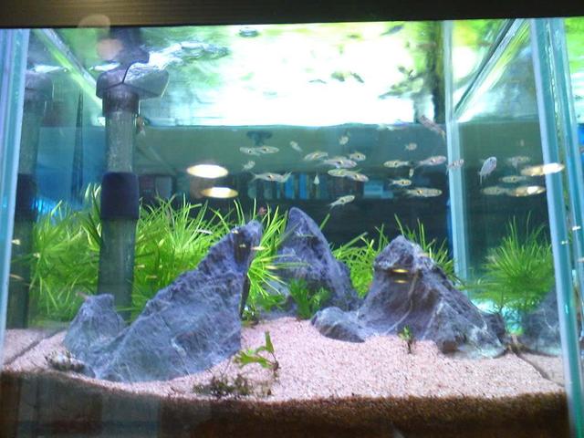 3、慢慢加入闯缸鱼,刚建立的鱼缸可以逐渐加入闯缸鱼,一般我以鹦鹉和地图鱼为主,但是不宜过多,以免大量的残饵和排泄物产生的毒素超过硝化细菌氧化分解能力,造成水质污染,成相反作用。
