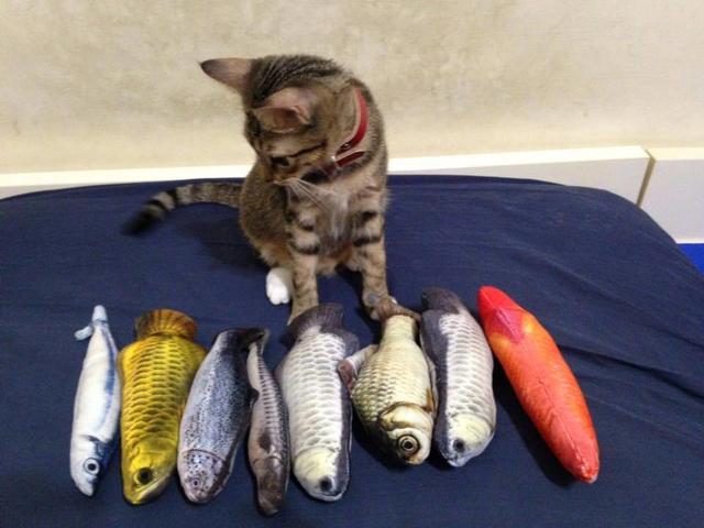主人见猫咪是如此的喜欢这样的玩具,于是就一股脑的给它买了好多,这些各种各样的鱼一起摆在了小鱼的面前。这回猫咪有点紧张了,根本不知道哪一个比较好,选了半天也也没有拿定注意,这对于猫咪来说,还是比较纠结的一个问题。