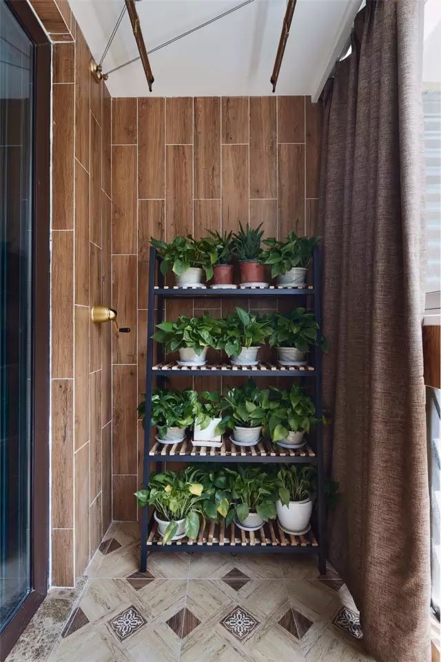 木纹墙砖和复古地砖,再配上几盆绿植,格外的自然清新。只是绿萝是喜阴植物,阳台的光照较充分,换几盆喜阳植物会更好。