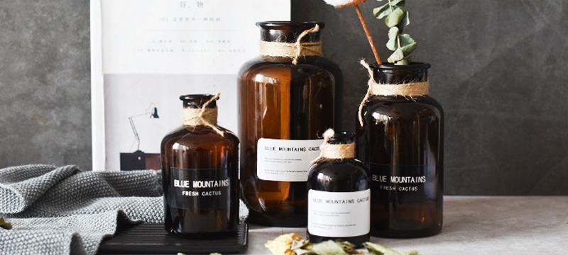 花艺自然要有花器来展示,合适的花器会使得整个花艺产生意想不到的美观感触。棕色玻璃花瓶,如同药剂瓶子一般,神秘而带有略微的苦涩感。瓶身处还设计有英文书写标签,复古感突出。瓶口大小适中,无论鲜花还是干花都十分适宜。