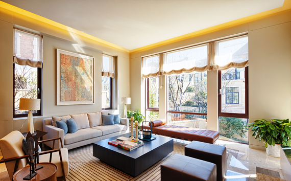 客厅中点式布置的各种绿植起到了很好的点缀效果,绿色的植物也与浅色系的客厅形成了明显的反差;叶形独特的绿植在客厅中的装饰效果不亚于组合花卉,同时大叶形的绿植也使空间显得更大气。