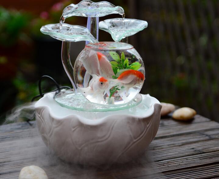 大家有想过喷泉与鱼缸的结合吗,这样的工艺品的一种艺术的结合。这款鱼缸便是采用这种理念制作而出。不仅有着暖色黄灯制造出的温暖效果,巧妙的设计出花瓣流水,让整个鱼缸看起来艺术感极强。