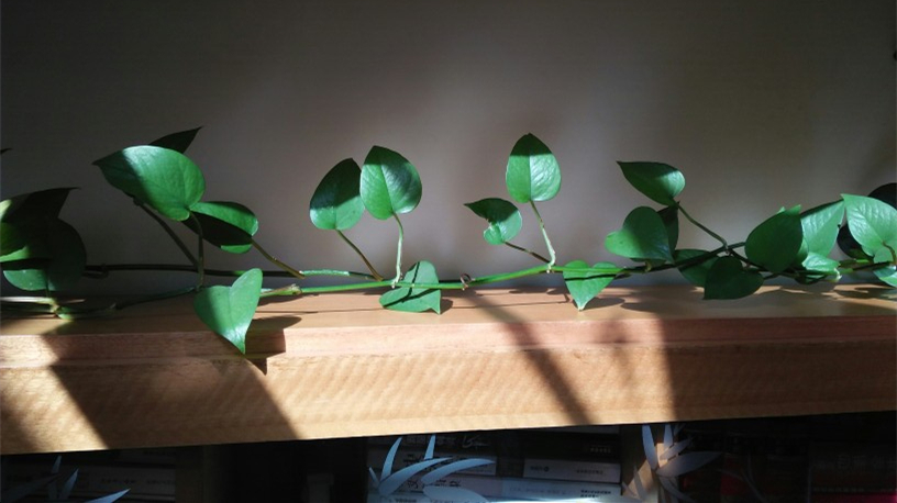 绿萝喜阴,强光照射会引起叶子发黄、叶缘发枯,并且叶片部分会出现黄斑。相反,长时存放在阴暗地方,叶片得不到足够的阳光照射,无法形成叶绿素,也会造成绿萝叶子发黄,需及时补光。