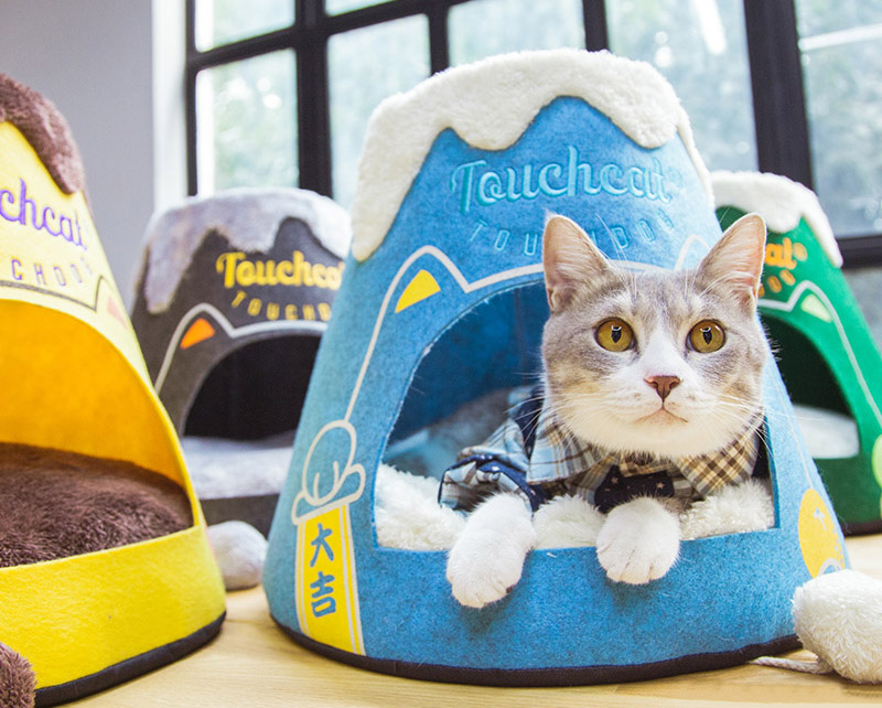 它是模仿富士火山造型来的,再利用一些超级卡通的线条勾勒边框,以及字母图案洋洋洒洒的点缀,让喵窝显得更加可爱。