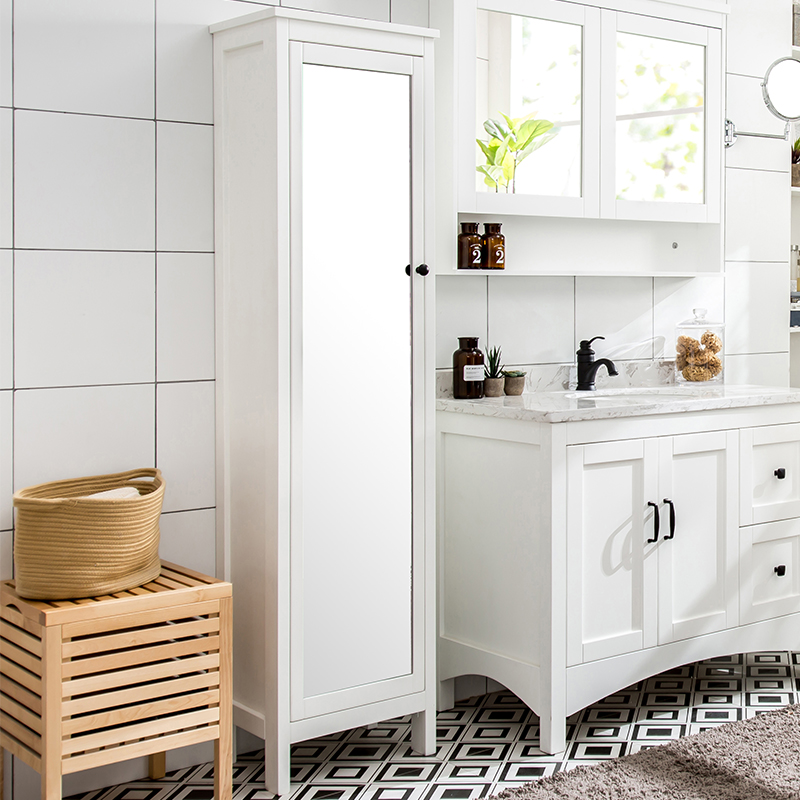 细长款的浴室柜不仅能保障收纳空间,还能最大程度的减少浴室占地面积的效果。让浴室的杂物使用更加随心顺手,更整洁。北欧风情设计,让浴室也充满了格调,大型穿衣镜,更加方便洗浴生活。