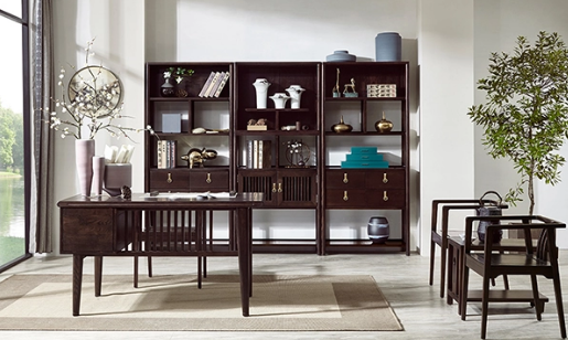 新中式的书房,是中式风格与现代元素的巧妙兼柔,家具方面对传统的明清家具有很多继承,以实木材质为主,颜色上多是棕红或者檀木色,偏深色系。