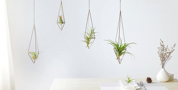 空气凤梨最爱的姿势就是被吊起来,纤细的黄铜色花器,既能满足它的需求,又能保证美观性,采用简单的几何造型,却有着不简单的视觉效果,很好的把空气凤梨结合在一起,给空间带来许多的清新自然。
