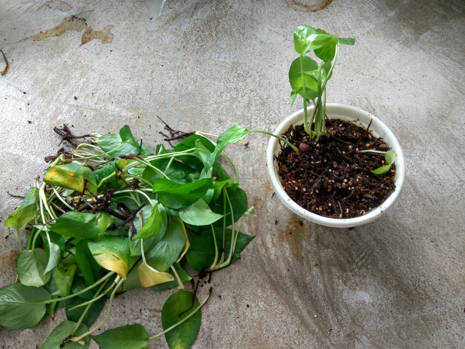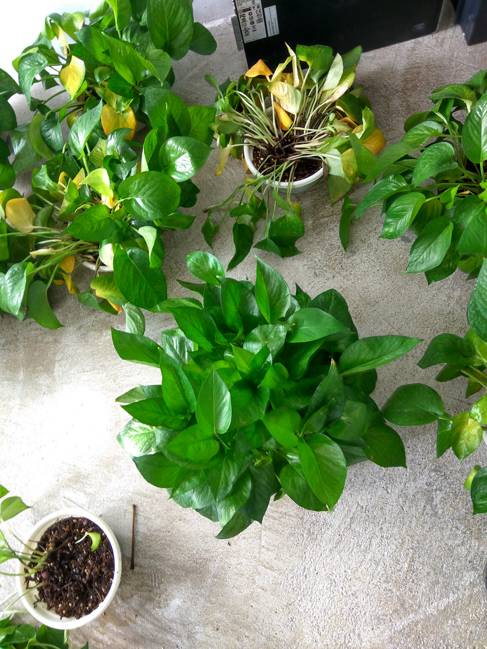 ①向上面的情况属于非常严重的情况,使用的颗粒尿素,而且还大量用水,导致的肥料浓度高,出现了烧苗的情况,对于特别严重的最好的解决办法就是直接换土,这个土千万不能养绿萝了,我试了很多的办法,只要是用原来土的,绿萝没有转绿的,反而更加严重。
