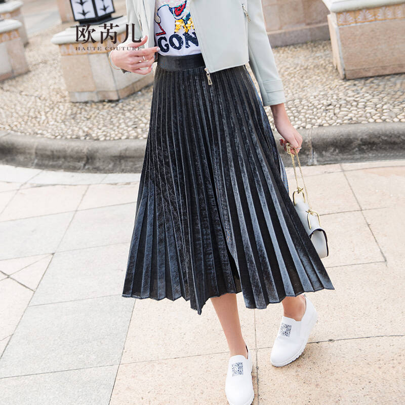 olrain欧芮儿2017年春装新品简约气质百搭半身裙修身纯色收腰百褶裙长裙2801 深灰色 S