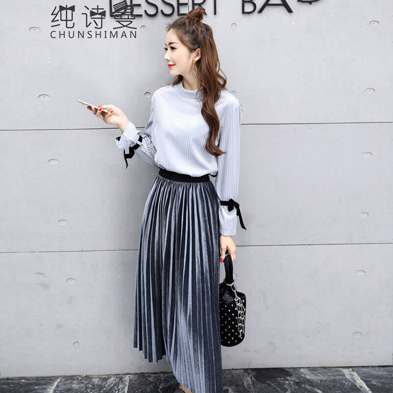 纯诗曼2017年春季修身韩版显瘦纯色气质优雅甜美套裙 灰色+深蓝灰 M