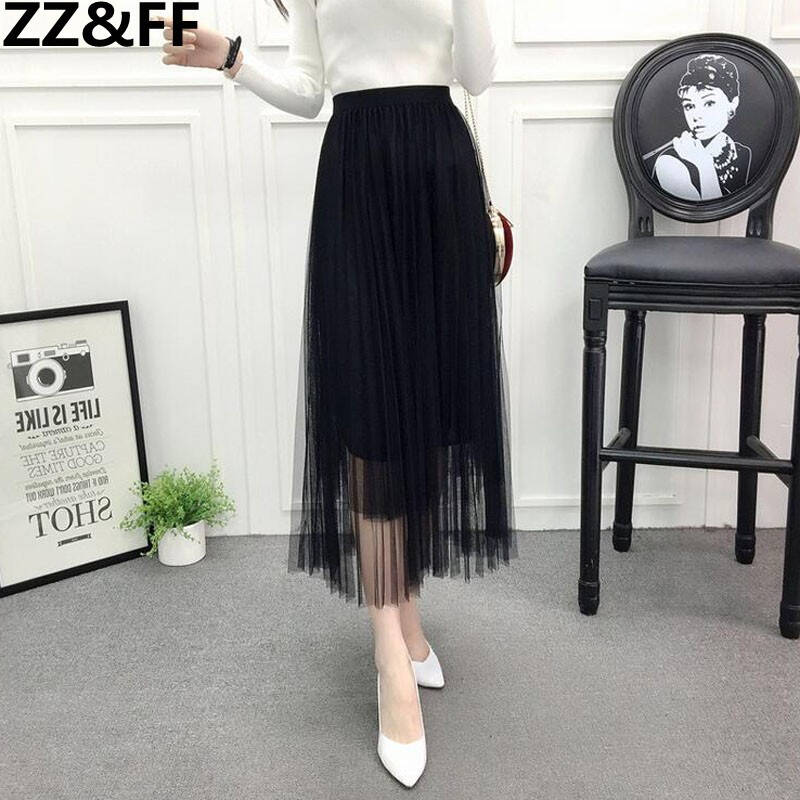 ZZ&FF 2017春夏新款中长款高腰压折网纱半身裙百褶裙A型裙子 8065 黑色 均码