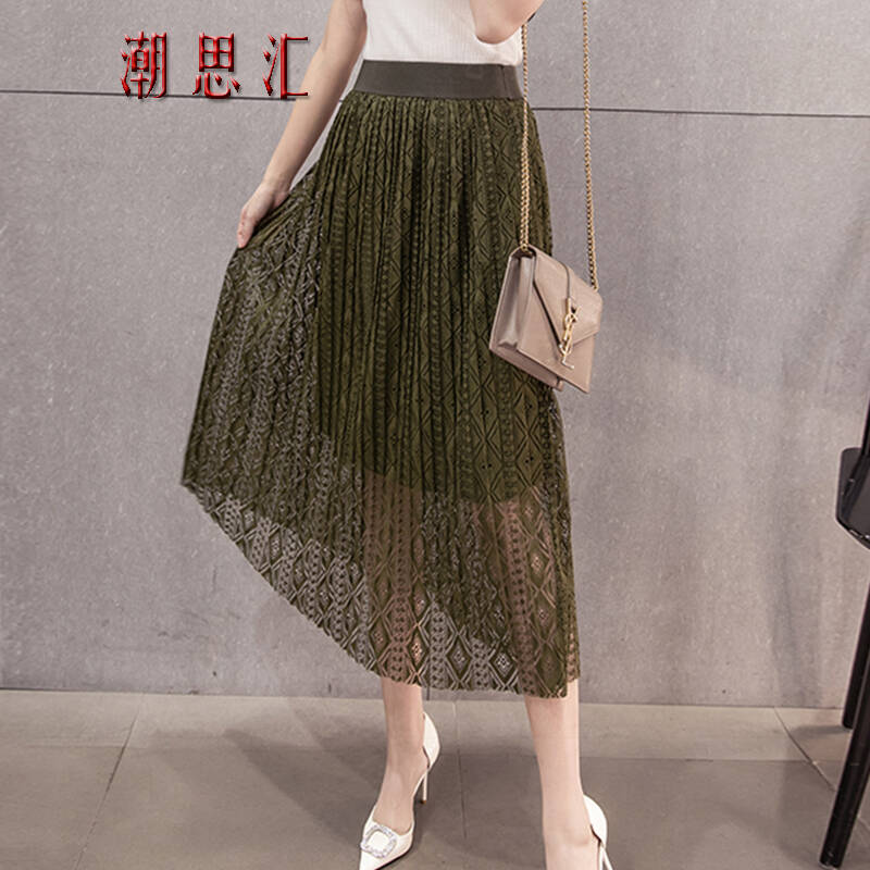 潮思汇半身裙春2017新款中长款A字裙韩版高腰百搭蕾丝百褶裙蓬蓬裙 军绿色 L
