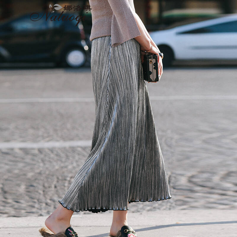 娜洛琪 2017春季新款韩版高腰半身裙中长款百搭百褶裙a字裙 灰色 M