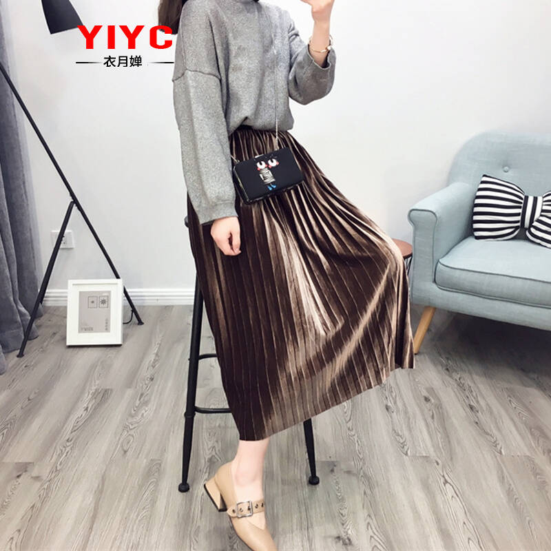 2017春季新款韩版金丝绒高腰半身裙A字裙连衣裙百褶裙子 金色 均码