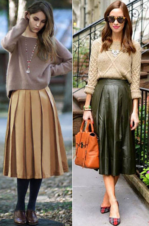 如果你是优雅复古派,一条有质感良好的宽褶中裙便能让你优雅迷人的毫不费力,高腰的设计则将你身形上的曲线完美展现,同时又能很好的拉伸比例美。出街的时候约针织毛衣相搭配,显得相当的和谐。