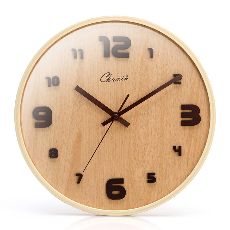 初心 24小时制木质欧式钟表 现代艺术挂钟客厅表时尚创意 静音 装饰摆件 12小时制本色