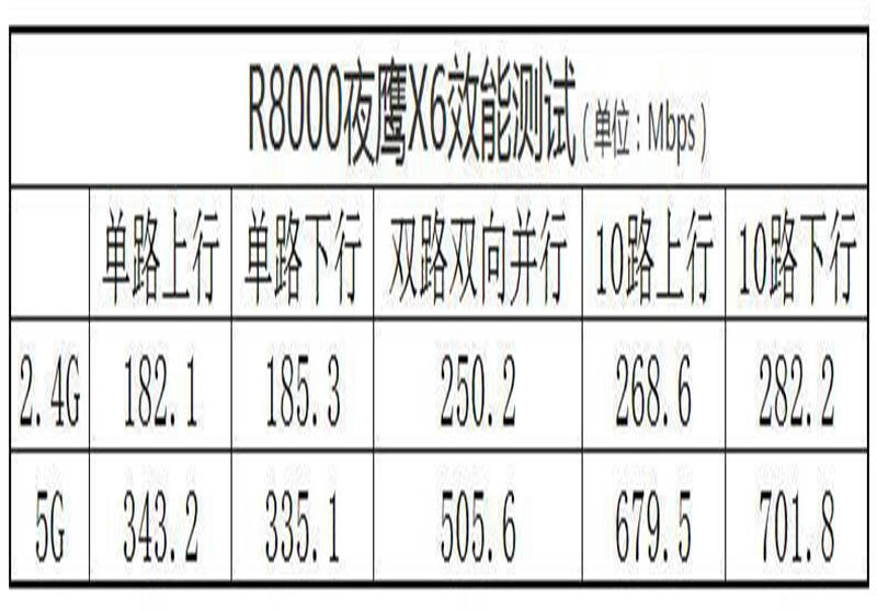 笔者用IxChariot 6.7测试软件分别对R8000的2.4G频段以及5G频段进行了单路上行、单路上行、单路下行、双路双向并行、10路上行并行、10路下行并行共5种情形的测试。结果显示R8000在.4G网络频段和5G网络频段分别跑出了最高282.2Mbps和701.8Mbps的成绩,对比2.4G 600M、5G 1300M的理论带宽,分别达到了理论值的 47.0%和53.9%,尤其是5G网路达到了700M以上,着实让人佩服网件的实力。