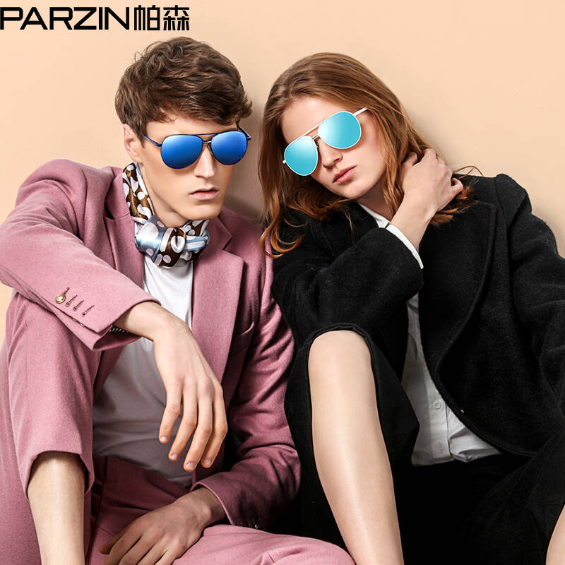 帕森(PARZIN)男女时尚炫彩膜蛤蟆镜 偏光太阳眼镜 经典驾驶潮墨镜 8028 白框反光膜冰蓝片