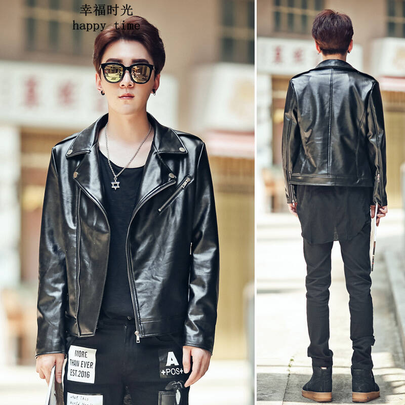 幸福时光皮衣男修身韩版短款PU皮夹克机车服翻领外套青年休闲修身机车皮衣翻领PU皮夹克男装 黑色 M